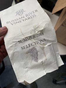 This is NOT the box the wine was sent in. This is not the official packaging Russian River uses. It also has a label that was CLEARLY removed from another box and added to this one. The interior bottles were packaged in a weird, aftermarket styrofoam contraption that left them boxed up cork down, fully exposed to the box sides with no protection against the bottom of the box (WTF?!) after being individually sealed in plastic bags. The original paperwork is heavily liquid damaged, and the box was haphazardly constructed by shelling two ends of two smaller boxes together with this waterlogged ad-hoc MacGyver contraption inside.