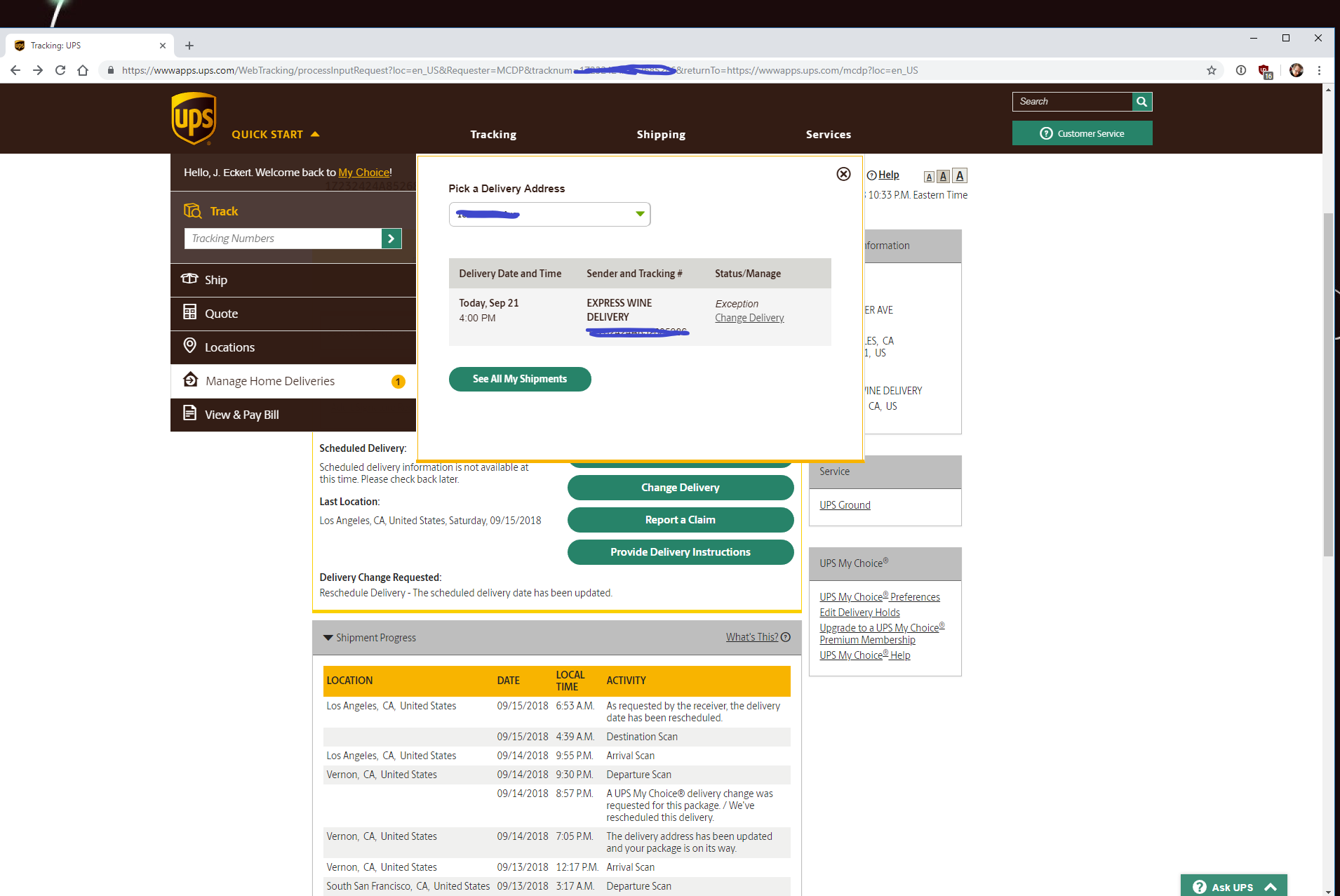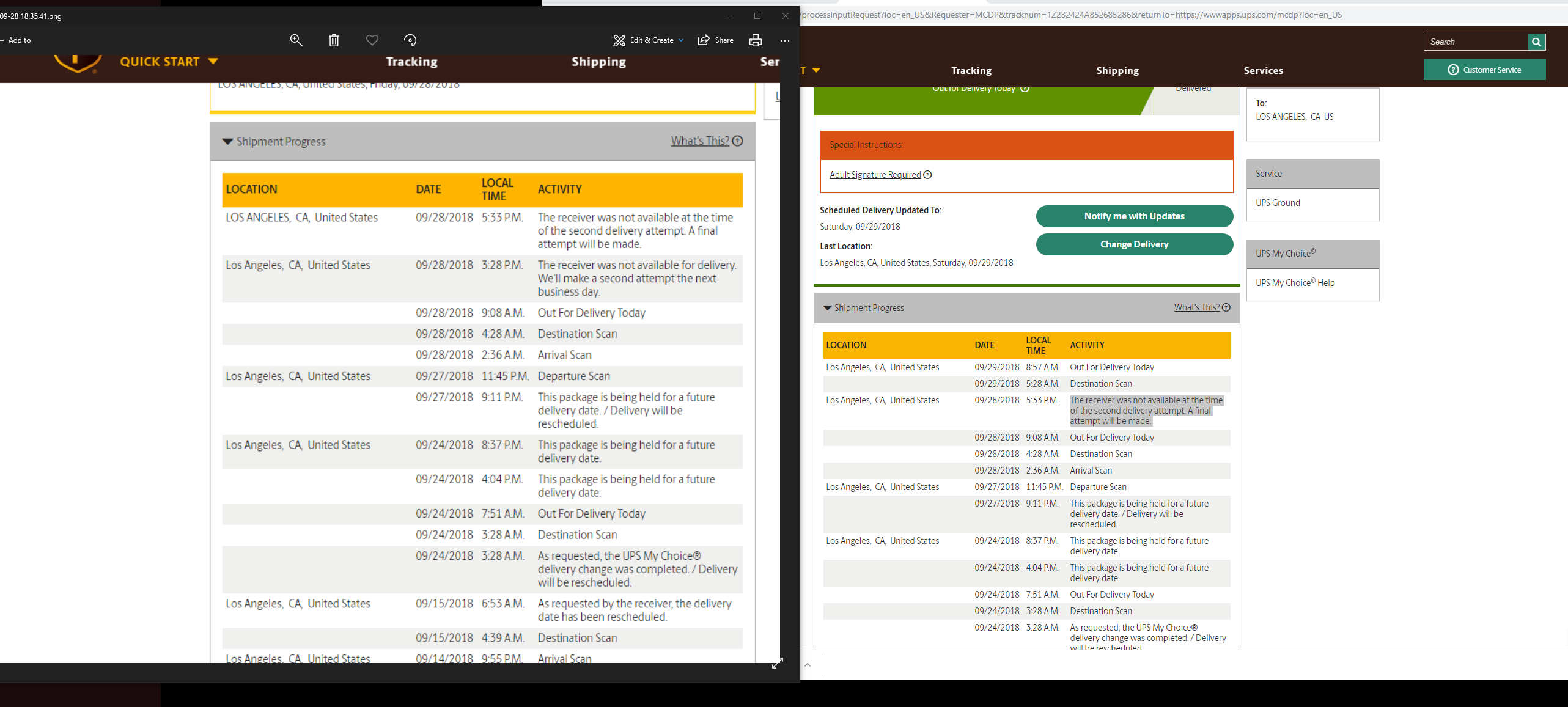 UPDATE 8: I just got off the phone with UPS. I refused to end the call until I had the package re-routed somewhere else, and for ONCE they didn’t say no… on top of that he even went to a few different supervisors to try and get the fees waived so I wouldn’t have to pay them… and now it’s due to be delivered at my office on October 2nd (friendly reminder the original date was Sept 11th!) . I won’t be there as I’ll be out of town starting that morning, but that’s fine, the front desk can at least sign for it for me and hold it till I come back on the 4th.