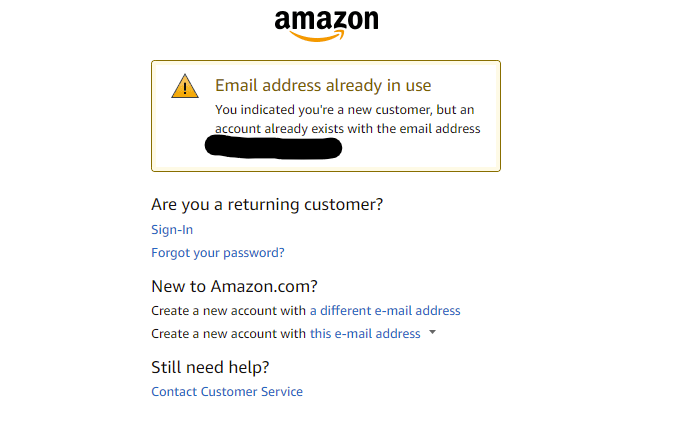 So then I took matters into my own hands, and tried to create a new Amazon account using this email address. When I signed up with the email I got a screen that said “You indicated you are a new customer, but an account already exists with this email address”.